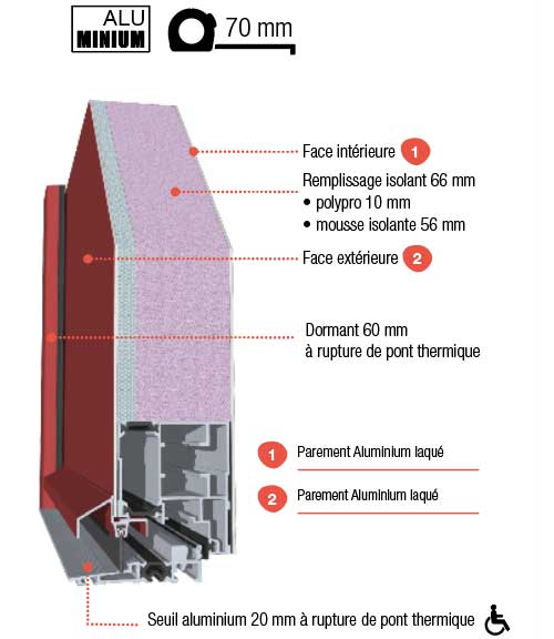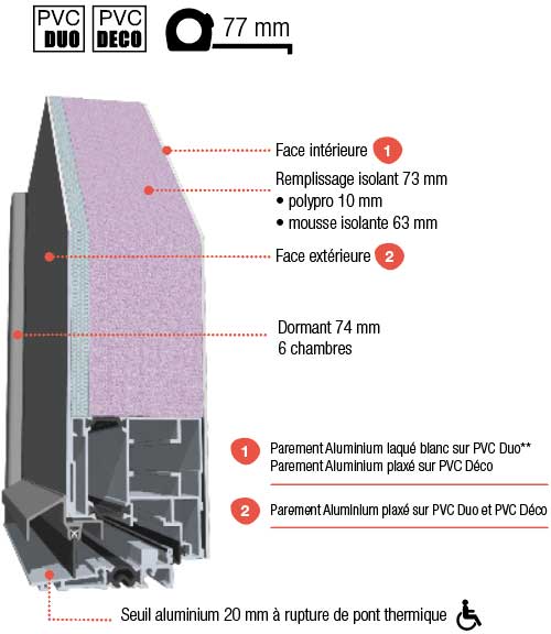 Les schémas ci-dessous détaillent les sections et caractéristiques propres à chaque ouvrant, selon le type de matériau et l’épaisseur associée.